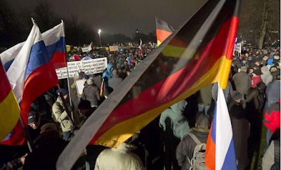 U gradu Drezdenu, u oblasti Saksonija u Njemačkoj, održan je protest na kojem su se vijorile njemačke i ruske zastave, što je do pre svega godinu dana bilo nezamislivo, piše njemački list Di Velt.